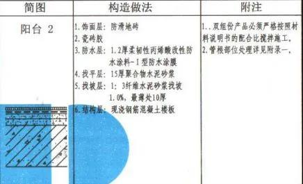 结构层→找坡层→找平层→防水层→瓷砖胶→饰面层,这种做法的找坡层要用1:3纤维水泥砂浆做找坡1.0%,最薄处10mm厚,找平层用15mm厚聚合物水泥砂浆,找平层之上涂刷1.2mm高弹型聚合物防水涂料。